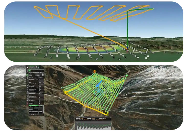DTM's (Digital Terrain Model) are detected using aerial photography at low heights with a geometrically calibrated camera. This enables the drone to obtain all the heights of the surveyed terrain. In these models, each pixel stores 2.5D information, including the X, Y, and Z values corresponding to the highest altitude.